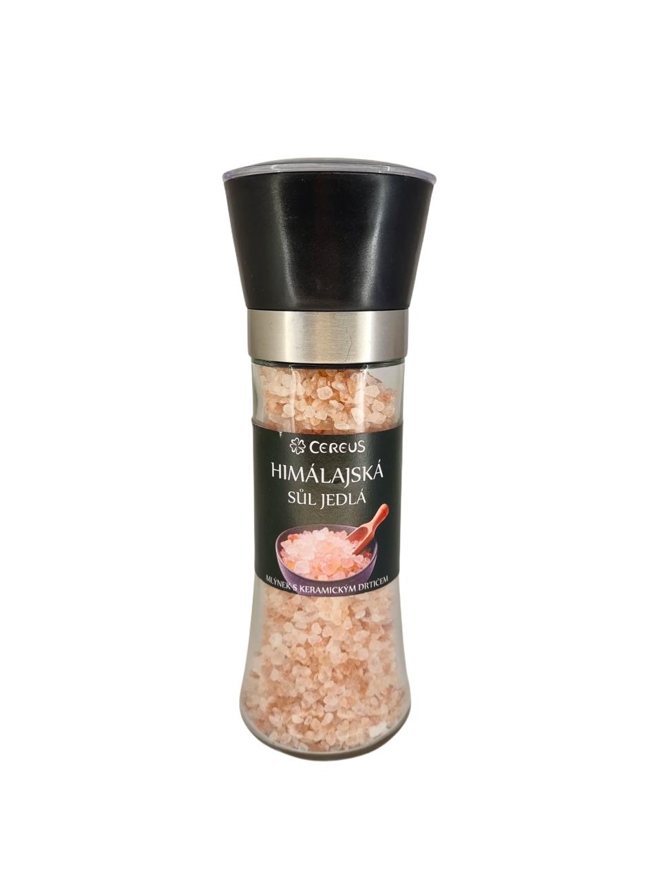 Himalájská růžová sůl Cereus ve skleněném mlýnku a s nerezavějícím keramickým drtičem.